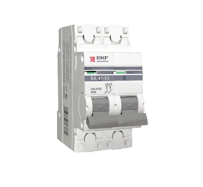 Выключатель автоматический 2п 50А С ВА 47-63 4,5кА ЭКФ. Предназначен для защиты электрических установок от перегрузок и коротких замыканий, а также для нечастых включений и отключений электрических цепей. Устанавливается только в сухих помещениях.