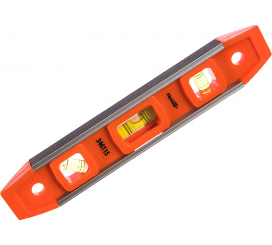 Усиленный магнитный уровень Sparta «Торпедо» (IV) 346115 длиной 230 мм, пластмассовый, с 3 глазками, — оптимальный вариант для бытового использования. 3 глазка служат для проверки горизонтальных и вертикальных поверхностей и соответствия углу 45 градусов. За счет небольшой длины инструментом удобно работать в труднодоступных местах и ограниченном пространстве.