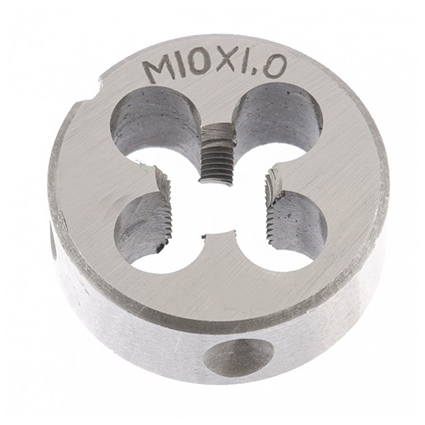 Плашка М10 х 1,0 мм - сделана из инструментальной стали. Предназначена для нарезания внешней резьбы ø 10 мм. Отверстия служат для отвода образующейся стружки. Режущие кромки имеют твердость 60 HRc.