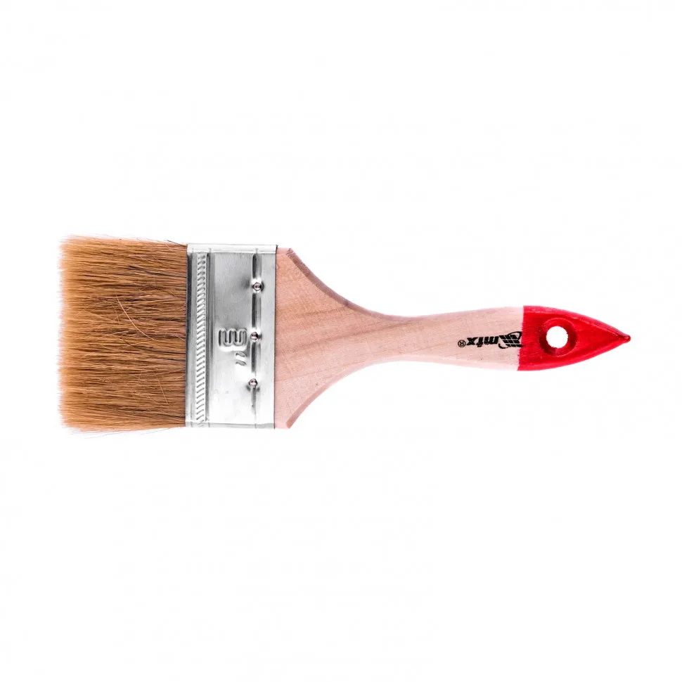 Плоская кисть MTX «Стандарт» 82540 шириной 3 дюйма (75 мм), с натуральной щетиной и деревянной ручкой, — недорогой инструмент для проведения бытовых малярных работ. Натуральная светлая щетина обладает высокой износоустойчивостью и подходит для нанесения красок на основе растворителей. А благодаря ширине 75 мм кистью удобно окрашивать большие поверхности.