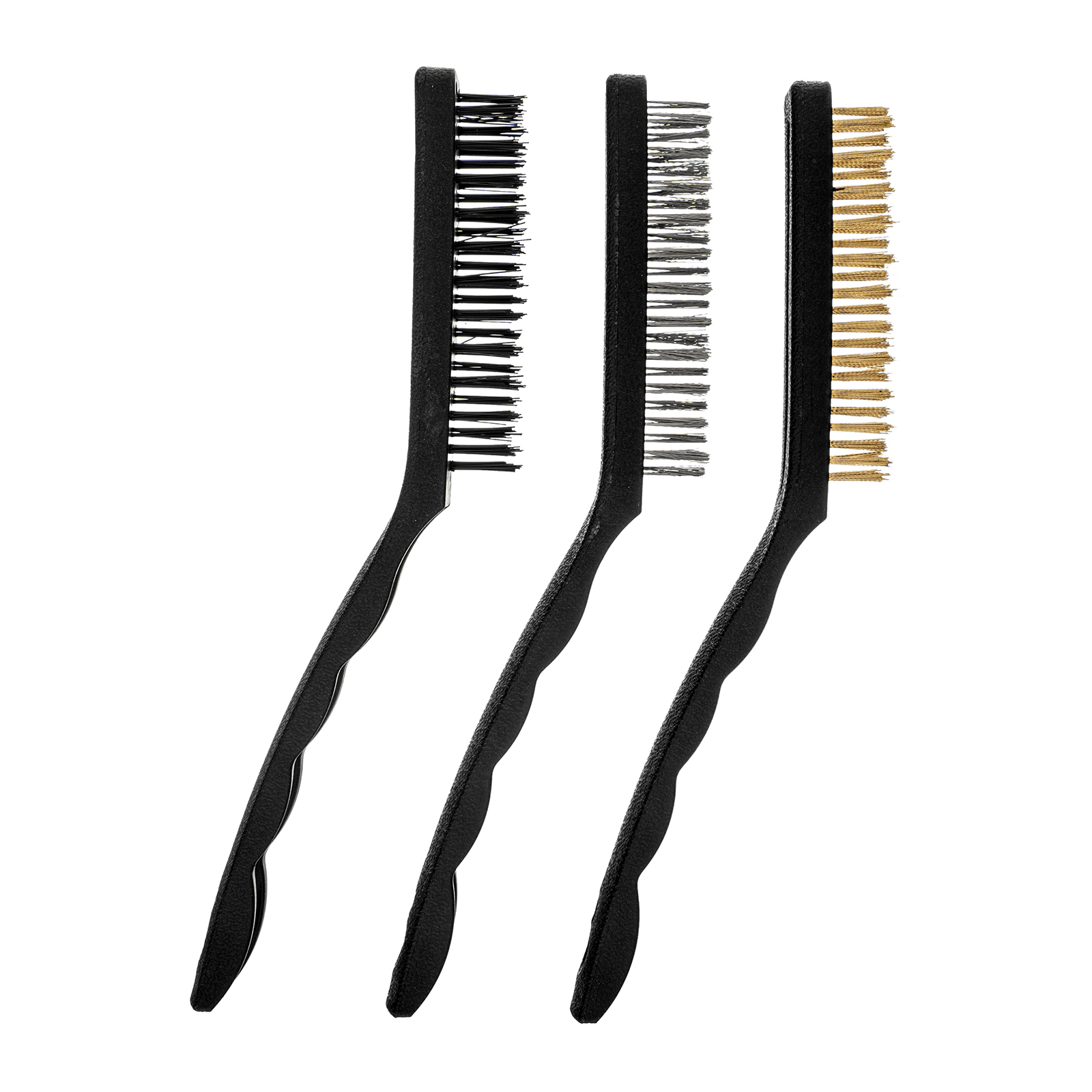 Набор из 3 больших щеток Matrix 74863 с пластмассовыми ручками предназначен для различных видов обработки — стальные удаляют ржавчину, загрязнения и старую краску с металлических и других поверхностей, а нейлоновая браширует и мягко очищает деревянные изделия.