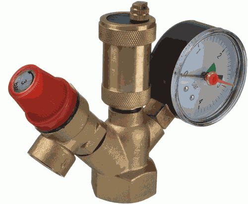 Группа безопасности из латуни представляет собой набор предохранительных элементов, предназначенных для защиты системы отопления от превышения максимально допустимого рабочего давления, которые размещаются на отдельном коллекторе, подключенном к системе отопления с помощью резьбовой муфты. В состав группы безопасности входят предохранительный клапан с фиксированной настройкой на 3 бар., автоматический воздухоотводчик и манометр.