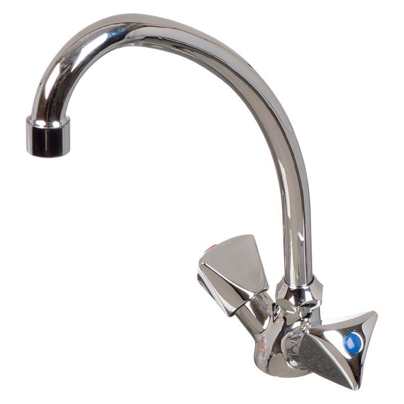 Смеситель для кухни MELODIA Dinatro MDV40105 изготовлен из хромированной латуни, с высоким поворотным изливом, смешивание воды происходит с помощью двух маховиков с керамическими кран-буксами, без гибкой подводки в комплекте.