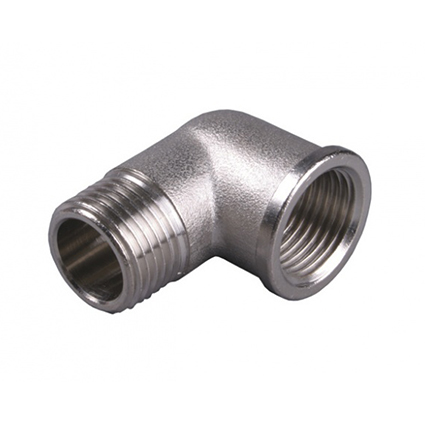 Угловой латунный никелированный фитинг. Резьба – внутренняя/наружняя, цилиндрическая трубная по ГОСТу 6357 (ISO 228, EN 10226), совместимая также с наружной конической резьбой по ГОСТу 6211 (ISO R7).