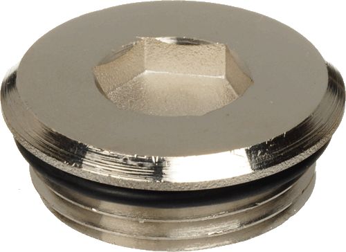 Пробка для коллектора 1"TeRma (06401) латунная никелированная пробка c наружной резьбой, используемая для закрытия неиспользуемого присоединительного отверстия коллектора с условным диаметром 1". Головка – круглой формы, под шестигранный ключ. Уплотнение – кольцо из резины