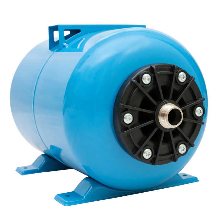 Гидроаккумулятор выполнен из стали и имеет порошковое покрытие устойчивое к коррозии. Для установки гидроаккумулятор оснащен ножками с возможностью жесткого крепежа. Нижний пластиковый фланец обеспечивает подключение гидроаккумулятора в систему водопровода. В верхней части имеется ниппель для подкачки и проверки давления в гидроаккумуляторе.