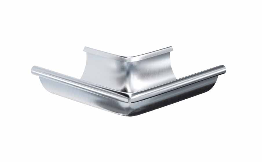 Изготовлен угол желоба, как и вся водосточная система Аквасистем из прочной оцинкованной стали и защищена специальным полиуретановым покрытием Pural, который препятствует образованию коррозии.