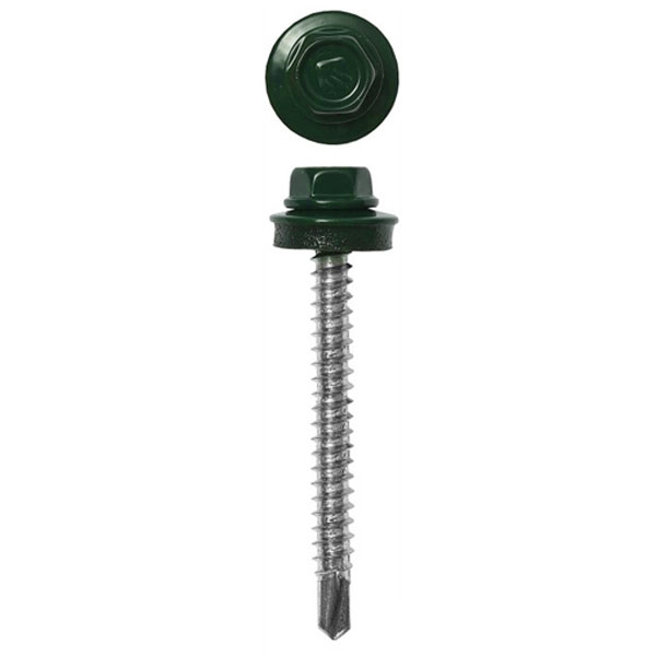 Саморез с шестигранной головкой, шайбой с резиновой уплотняющей прокладкой и сверлом на конце, позволяющим осуществлять монтаж без предварительного засверливания.