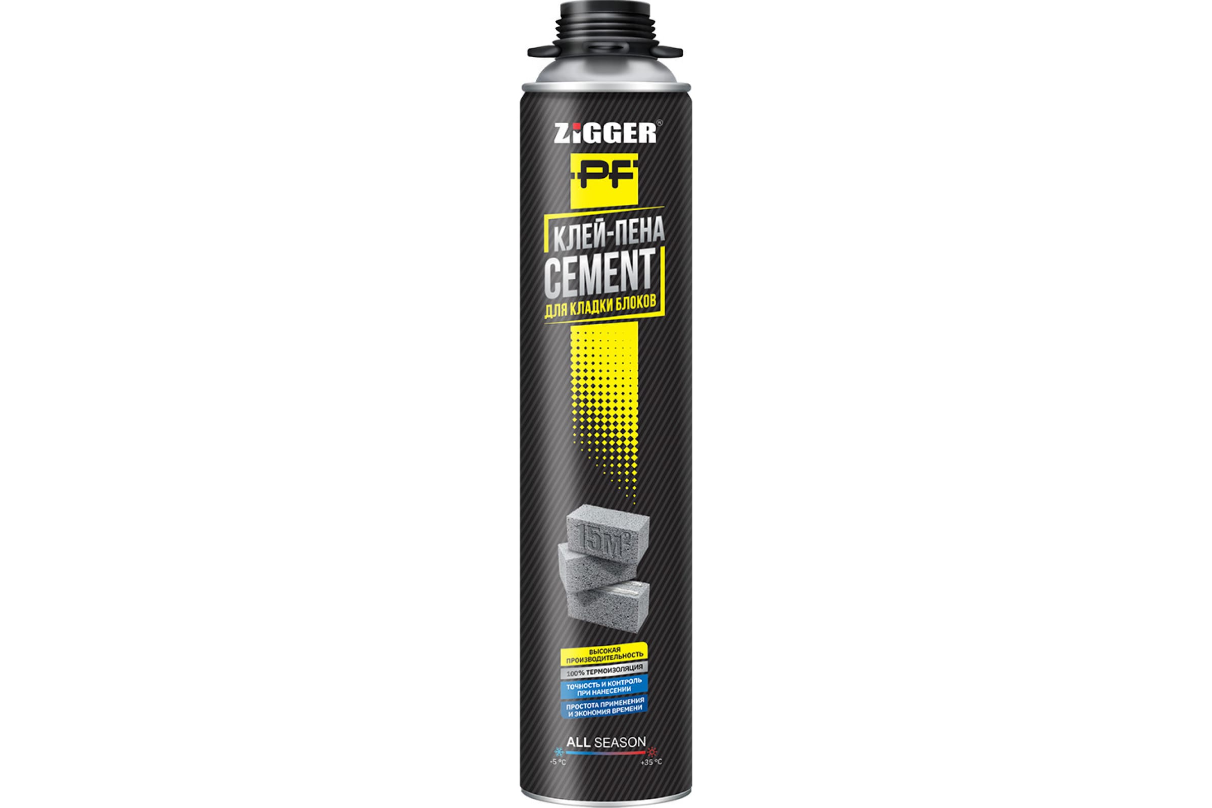 Клей-пена ZIGGER CEMENT ПРОФ (всесезонная; 850 мл; 950 гр) 11607326 с низким коэффициентом вторичного расширения предназначена для возведения стен и перегородок при монтажных и ремонтно-строительных работах внутри и снаружи помещений. Обладает низкой теплопроводностью, значительно сокращает время кладки, не требует дополнительного оборудования, не содержит вредных растворителей и наполнителей.