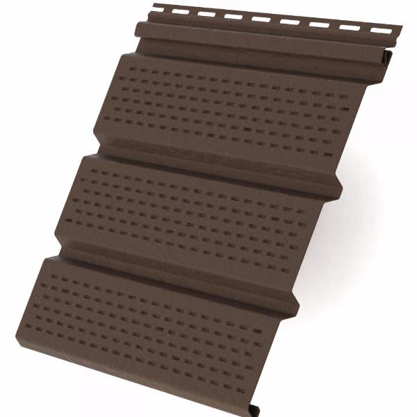 Металлический софит как перфорированный, так и сплошной применяется для подшивки карнизного и фронтонного свесов. Наличие перфорации обеспечивает вентиляцию подкровельного пространства, то есть следствие оптимальные условия эксплуатации кровельного пирога.
