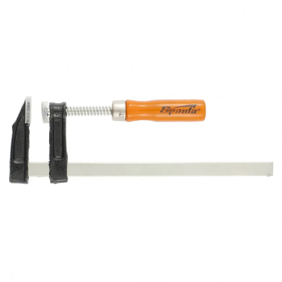 F-образная струбцина Sparta 204265, 200 х 50 х 250 мм, используется в столярном и слесарном деле и позволяет фиксировать заготовки из металла, древесины и других материалов для их соединения или обработки. Деталь помещают между губками, одна из которых подвижна и служит для регулировки величины захвата. Винтовой зажим позволяет прикладывать значительное усилие для надежной фиксации. Защитные накладки предотвращают повреждение детали. Элементы конструкции выдерживают высокую температуру, поэтому струбцина подходит для проведения сварочных работ, при этом пластиковые накладки необходимо снять.