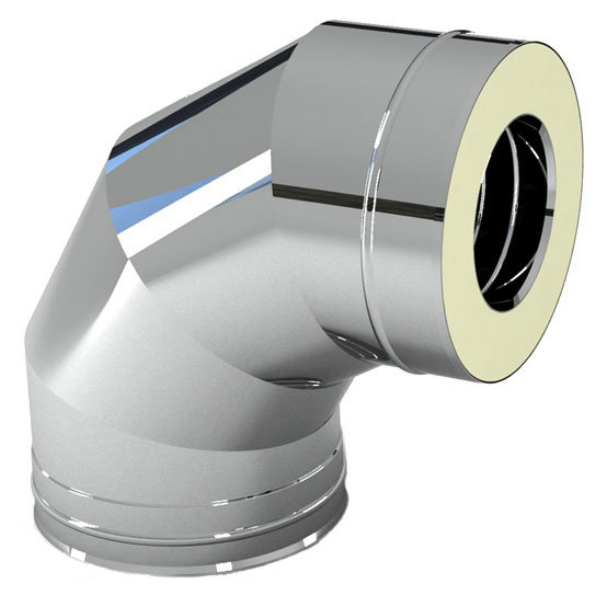 Отвод дымохода двустенный с изоляцией 90°, с толщиной стальных стенок - 0,5 мм; изоляцией 50 мм. При помощи данного сэндвич-отвода можно обогнуть препятствие или просто изменить угол прохождения дымохода.