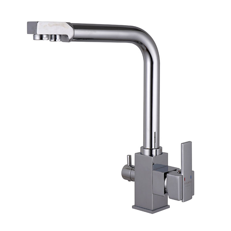 Корпус латунь хром, цинковые ручки в цвет корпуса, картридж керамический Wanhai 35 мм, дивертор латунный с керамическими дисками для включения фильтрованной воды, излив из нержавеющей стали 2в1 для обычной и отфильтрованной воды с аэраторами abs в цвет корпуса, гибкая подводка из нержавеющей стали 2шт по 50см и 1шт 25см, крепеж-гайка нерж.сталь+ латунь