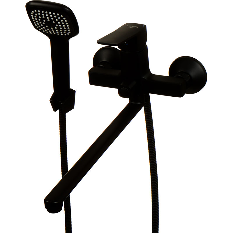 Смеситель для ванны с длинным изливом 35 см с аксессуарами в черном матовом покрытии, нанесенном методом гальванизации, что увеличивает его долговечность.
