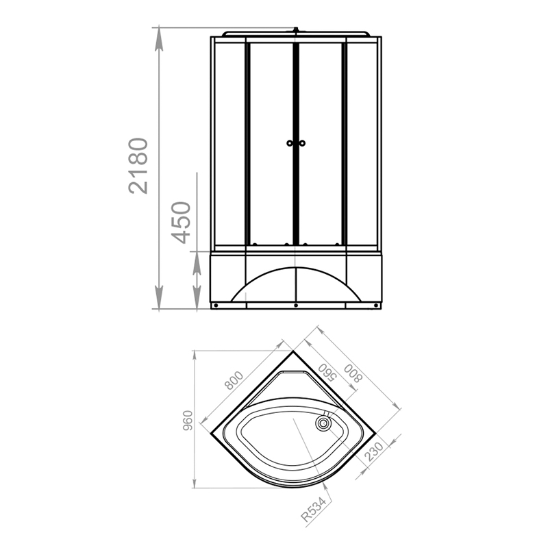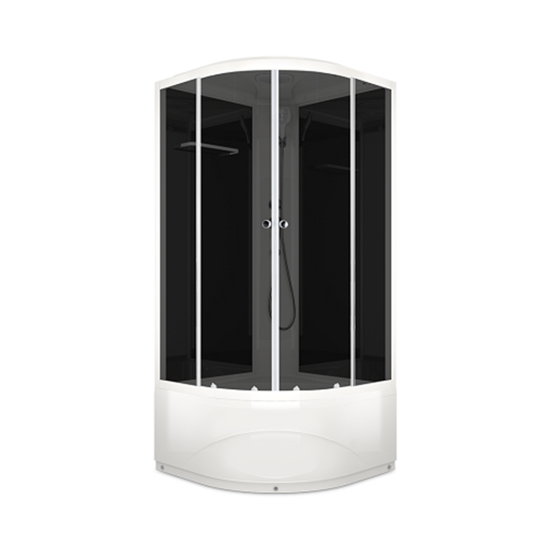 Угловая душевая кабина со стекляными тонированными стеклами, черными стенками и белым профилем. Высокий поддон. Открытие и закрытие двери одной рукой. В комплекте смеситель, верхний душ и ручной душ на гибком шланге. Полочка для ванных принадлежностей. душевая кабина укомплектована сливными кнопками с системой забора волос и другого мусора, что позволяет сократить денежные расходы, связанные с чисткой или заменой канализации. Поддон усилен сплошной плитой ДСП 16 мм. Поддон, стенки и крыша изготовлены из прочного санитарного акрила.