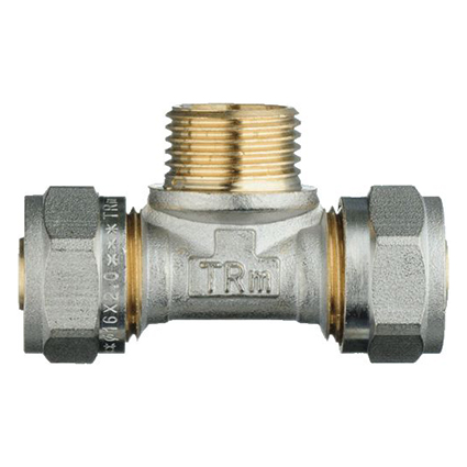 Тройник ТRm предназначен для создания разъемных и неразъемных соединений металлопластиковых труб с диаметром подключения 16х1/2"х16 ц/ш/ц. изготовлен из латуни «ЛС-59» в соответствии с международным стандартом качества CW617N, что гарантирует длительный срок эксплуатации изделия (свыше 50 лет). Нормативное давление составляет 25 бар.