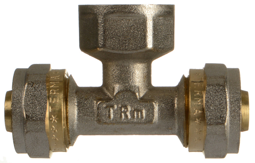 Тройник латунный никелированный 16*1/2"*16 цанга/гайка/цанга ТeRma 01402 предназначен для создания разъемных соединений в системах стальных и металлопластиковых трубопроводов. Температура рабочей среды до +95°C, нормативное давление 25 бар.