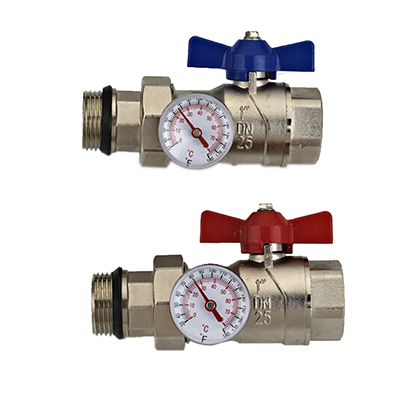 Кран со сгоном 1"с термометром (2 шт. красная и синяя бабочка) для коллекторных групп TeRma (33503) полнопроходной - соединитель с накидной гайкой. Кран шаровый произведен из высококачественной латуни, "бабочка" шарового крана изготовлена из алюминия (красная и синяя). Резьбы внутренняя с одной стороны и наружная резьба с разъемной гайкой для соединения с коллектором, снабжены термометором, который регулирует избыточную сетевую температуру воды для соединения с коллектором.