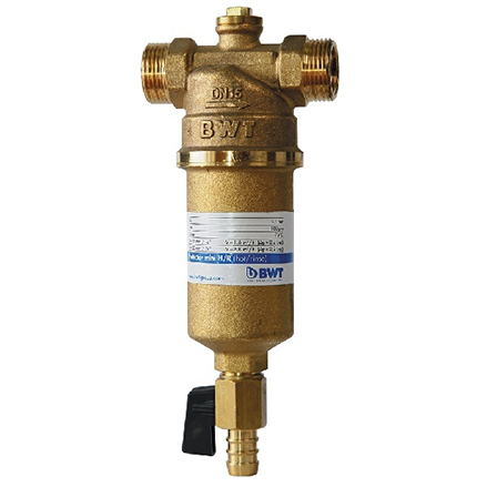 Водоочиститель BWT Protector Mini Г/в 3/4 прямая промывка Н604Р04 позволяет защитить краны, смесители и бытовую технику от механических загрязнений. Приспособление устанавливается на линиях горячей воды (до 70 °С). Верхняя и нижняя часть водоочистителя выполнена из латуни. В комплекте идет фильтр со стальным корпусом, который нужно промывать раз в 6 месяцев.