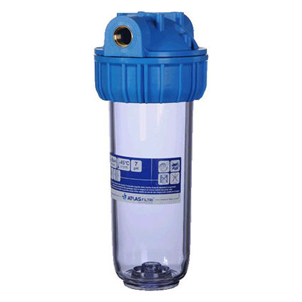 Корпус для фильтров ATLAS изготовлен из ПЭТ (полиэтилентерефталат) по специальной технологии итальянской компанией Atlas Filtri. Предназначен для размещения в нем фильтрующего элемента для тонкой очистки воды. Максимальное рабочее давление 8 бар, а максимальная рабочая температура 45°С, используется при нейтральной жесткости воды (7 pH).