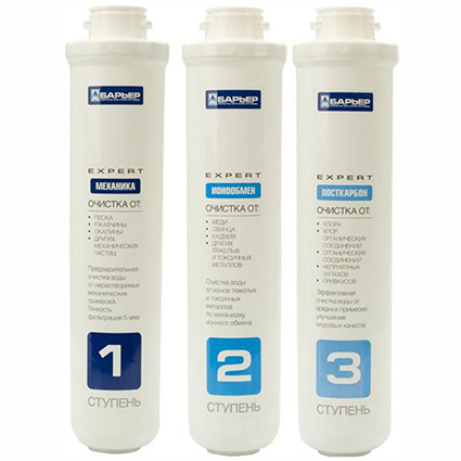 Комплект кассет для фильтра для очистки воды Барьер EXPERT Standard. Уникальная конструкция и система SmartLock позволяют мгновенно заменить картриджи и предотвратить их самопроизвольное откручивание при работе под давлением. Три ступени очистки обеспечивают комплексную очистку водопроводной воды от ржавчины, окалины, ила, песка, тяжелых токсичных металлов, растворенного железа, устраняют неприятные запахи и привкусы, предотвращает рост бактерий внутри филтроэлементов.