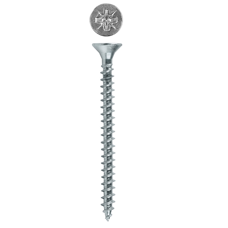 Универсальный саморез имеет двойной крестообразный шлиц PZ и потайную головку.