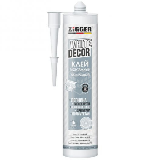 Клей акриловый ZIGGER WHITE DECOR, для декора, белый, 400 г для декора белый 03-02-16 монтажный клей на акриловой основе. Не желтеет и не имеет запаха. Может быть окрашен любыми красками после высыхания. Обладает прочным склеиванием, морозостойкость до - 20°С.