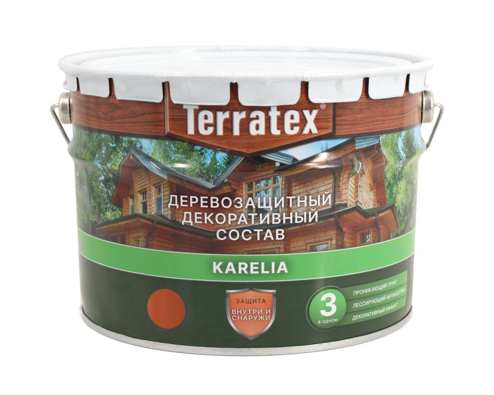 Деревозащитный декоративный состав Terratex Karelia предназначен для наружных и внутренних работ. Состав образует на поверхности древесины воздухопроницаемое биозащитное влагоотталкивающее эластичное полимерное покрытие. Благодаря содержанию УФ-абсорбирующих материалов состав обеспечивает высокую степень защиты деревянных изделий, эксплуатирующихся в жестких погодных условиях. Подчеркивает текстуру древесины и придает ей желаемый оттенок. Terratex применяется для покрытия любых наружных и внутренних стен, балконов, перил, плинтусов, заборов, садовых строений, фасадов домов, срубов, оконных рам и других конструкций из дерева, фанеры, ДСП и ДВП. Окончательный цвет финишного покрытия появляется после высыхания и зависит от типа древесины, качества подготовки поверхности и количества нанесенных слоев.