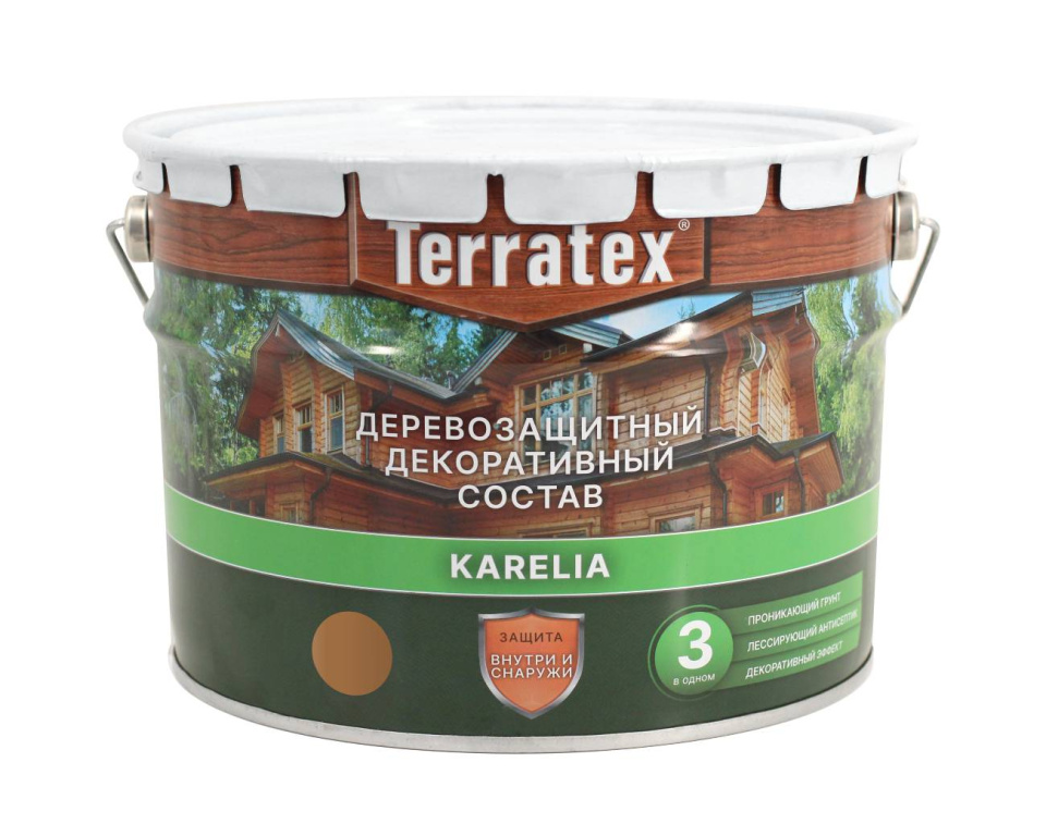 Деревозащитный декоративный состав Terratex Karelia предназначен для наружных и внутренних работ. Состав образует на поверхности древесины воздухопроницаемое биозащитное влагоотталкивающее эластичное полимерное покрытие. Благодаря содержанию УФ-абсорбирующих материалов состав обеспечивает высокую степень защиты деревянных изделий, эксплуатирующихся в жестких погодных условиях. Подчеркивает текстуру древесины и придает ей желаемый оттенок. Terratex применяется для покрытия любых наружных и внутренних стен, балконов, перил, плинтусов, заборов, садовых строений, фасадов домов, срубов, оконных рам и других конструкций из дерева, фанеры, ДСП и ДВП. Окончательный цвет финишного покрытия появляется после высыхания и зависит от типа древесины, качества подготовки поверхности и количества нанесенных слоев.