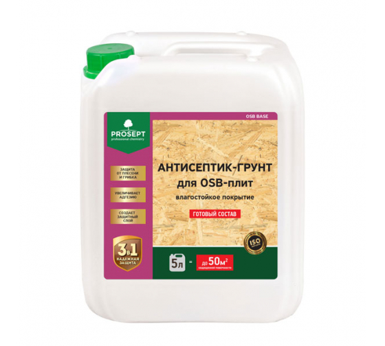 Антисептик-грунт для плит OSB PROSEPT ОSB BASE гот. состав 1л 044-01 с антисептическими добавками для создания прочного адгезионного влагостойкого слоя на поверхности плит OSB, ДСП, ГВЛ, ЦСП, а также для надежной защиты от биопоражений, плесени, грибов и разбухания. Предотвращает разрушение плит даже во влажных помещениях.