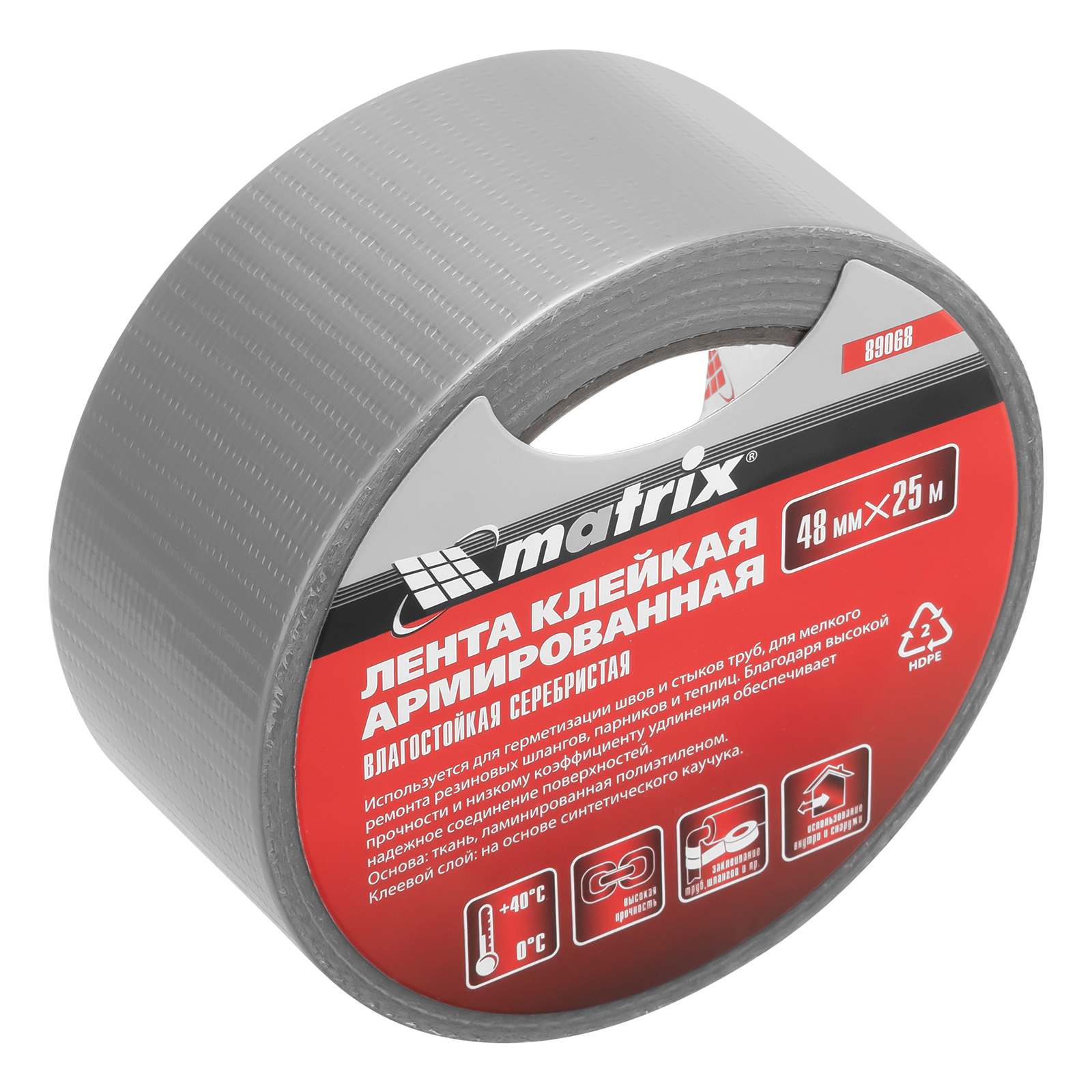 Влагостойкая клейкая армированная лента Matrix 89068 размером 48 мм х 25 м, серебристого цвета, позволяет решить множество задач в быту и на производстве. С ее помощью можно осуществить мелкий ремонт различных изделий, герметизировать соединения, предотвратить попадание пыли и воды на детали и т.д.